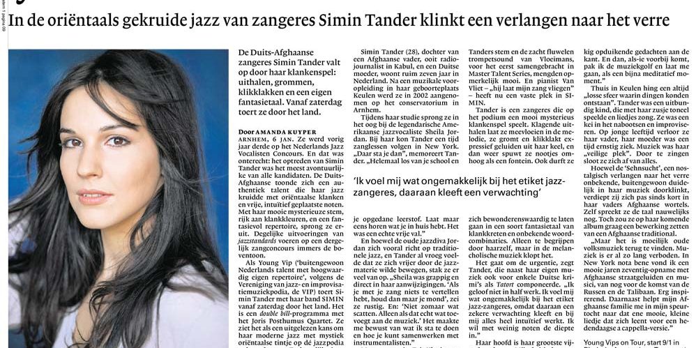 Jan.62010De Duits-Afghaanse zangeres Simin Tander valt op door haar klankenspel: uithalen, grommen, klikklakken en een eigen fantasietaal. […] Read More